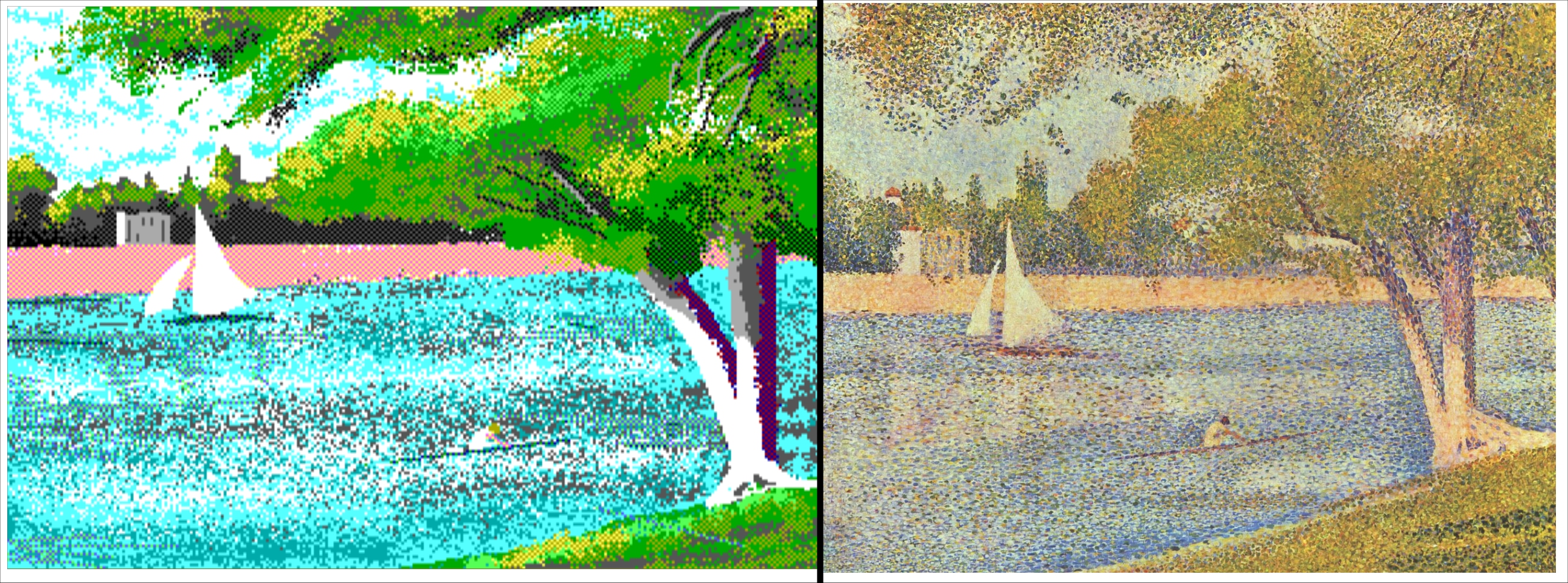 Interestingly, the image of the boat on the river is a reproduction of a Georges Seurat painting, 'The Seine and la Grande Jatte - Springtime 1888'